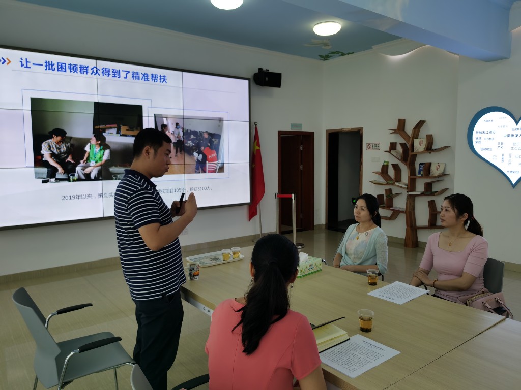 在荷塘区公益服务中心,区网格化管理服务中心主任杜杨和株洲市大同社会工作服务中心总干事王鹏详细介绍了公益服务中心在组织孵化、培育增能、公益创投、志愿培训等具体举措,并就荷塘区相对贫困人员精准帮扶项目工作开展情况进行了重点讲解。