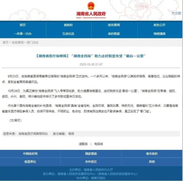 湖南省人民政府和湖南省医保局官网刊登《湖南全民保助力走好脱贫攻坚“最后一公里”》