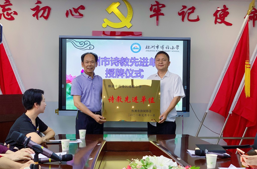 会议进行了隆重的授牌仪式。贺夏盛将“株洲市诗教先进单位”的金色牌匾授予荷塘区博雅小学。