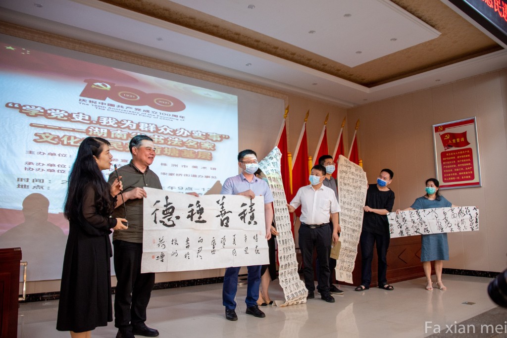群贤毕至,翰墨飘香暖民心,活动中,省、市书法名家为荷塘区宋家桥街道基层6个村、社区及群众代表送出精心创作的书法作品20余幅,践行“学党史•我为群众办实事”,以笔墨传情,献礼建党100周年。
