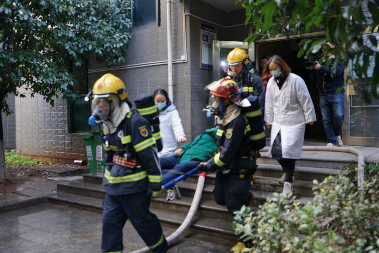 在锦玉华庭小区,按照演练情景设定,18日上午9时,株洲市荷塘区锦玉华庭小区一住户因厨房燃气管道连接处皮管老化燃气泄漏原因发生火灾,初期火灾面积约50平方米,火灾现场有大量浓烟,火势呈蔓延趋势,有人员被困。消防控制室发现火情后,立即通知巡逻人员携带灭火器前往查看处置,同时利用消防广播通知火灾区域人员及时进行疏散,并拨打“119”火警电话报警求助。警戒组、疏散引导组、灭火组按应急预案各司其职,警戒组对火场周围拉线警戒,疏散引导组逐楼层对被困人员进行引导疏散,灭火组利用室内消火栓对火灾进行控制,并用担架将受伤人员安全运离火场,120救护人员随机进行抢救。通过燃放烟雾弹模拟现场浓烟场景,所有参演人员按照规定动作弯腰低姿、手捂口鼻有序逃生至单元楼外。