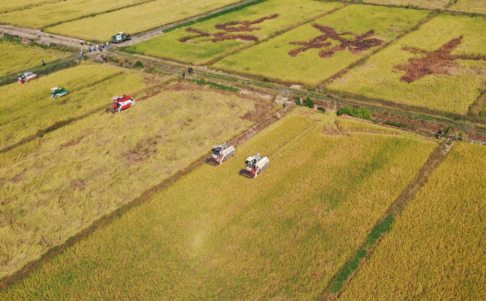 图为2021年9月22日,在湖南省衡阳市衡阳县库宗桥镇,农机手驾驶农机收割稻谷(无人机照片)。 新华社记者赵众志 摄