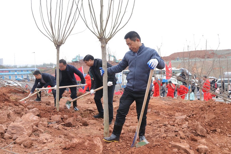植树现场,大家按照事先划定的地块,分工协作,干劲十足,挥锹铲土、填树入坑、踩实压紧,相互配合,每道植树工序都做得认真细致,植树现场热火朝天。不到一个小时,紫玉兰、白玉兰、广玉兰、红花木莲等400多株新栽的树苗迎风而立。党群齐心,干群合力,在大家的共同努力下,植树现场到处都是忙碌的身影,以及劳动的欢声笑语,现场呈现出一派如火如荼的劳动景象。