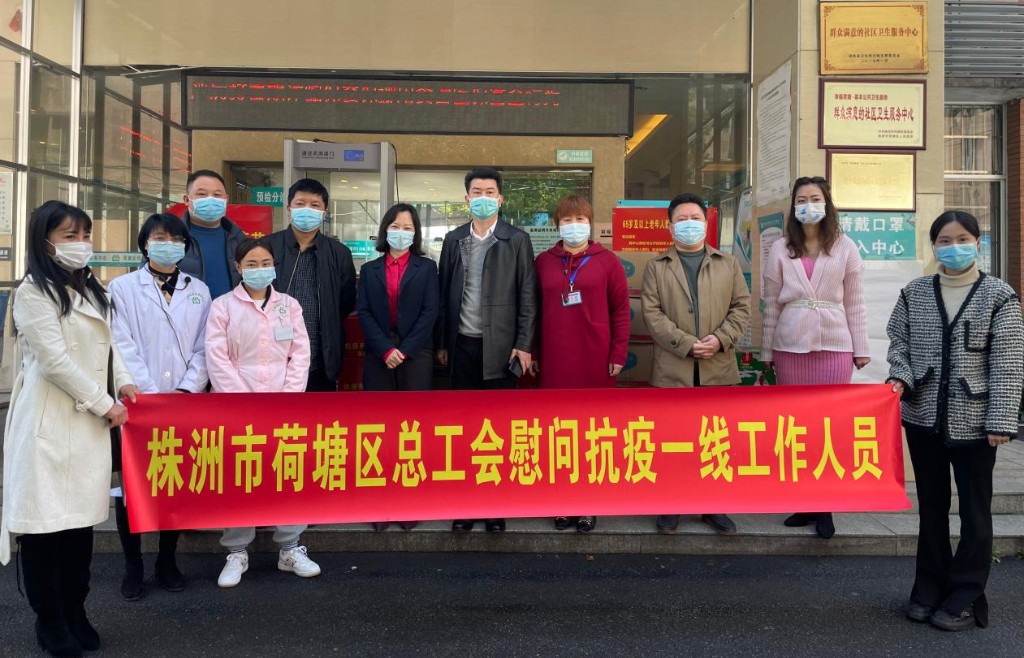 为关爱奋战在抗疫一线的工作者,助力我区疫情防控工作,3月28日,荷塘区总工会开展以“战疫有你、关爱有我”为主题的抗疫一线工作人员慰问关爱活动。区委常委、组织部长余鹏,区人大常委会副主任、区总工会主席朱福兴带队来到株洲东收费站、区疾控中心、月塘卫生服务中心、隔离酒店、社区等地,关爱慰问坚守抗疫一线岗位的医务人员、党员干部、社区工作者、驻点防疫工作人员、志愿者等,为他们送上党和政府的关怀以及工会组织的温暖。区人民政府副区长罗曼,区政协副主席、区卫健局局长冯晓等参加慰问。