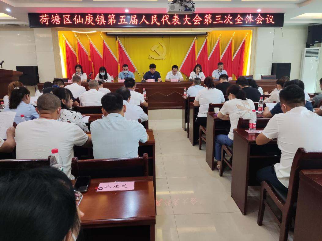 6月15日上午,荷塘区仙庾镇第五届人民代表大会第三次会议胜利闭幕,会议应到代表56名,实到46名,因事因病请假10名,符合法定人数。