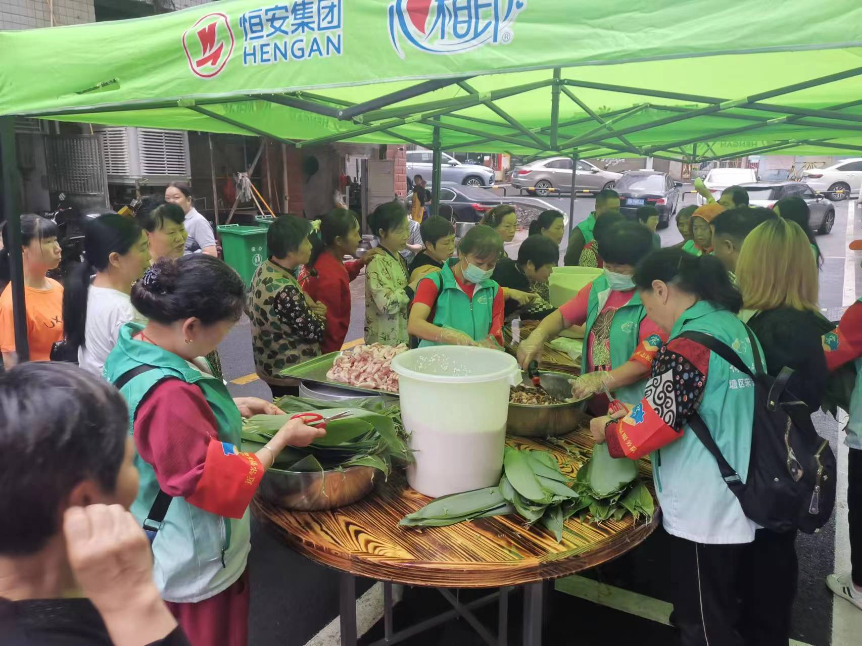 活动伊始,荷塘区委常委、宣传部部长张宇晨和宋家桥街道党工委书记吴平一为小区十位优秀邻长颁发证书,并鼓励他们继续位小区的规范化管理献策出力。活动现场,医疗志愿团队和小区诊所志愿医师为群众免费测量血压血糖,小区面食店老板准备了包子和麻园团子等小吃供大家免费品尝,有网红套圈游戏,有手工义卖……最热闹的还数包粽子大擂台,居民领到干净的粽叶,亲手体验包粽子,拿出看家本领,将粽叶做漏斗状、填糯米、压紧实、封口、扎捆,不一会儿工夫,一只只粽子瞬间成型,现场欢声笑语、其乐融融。