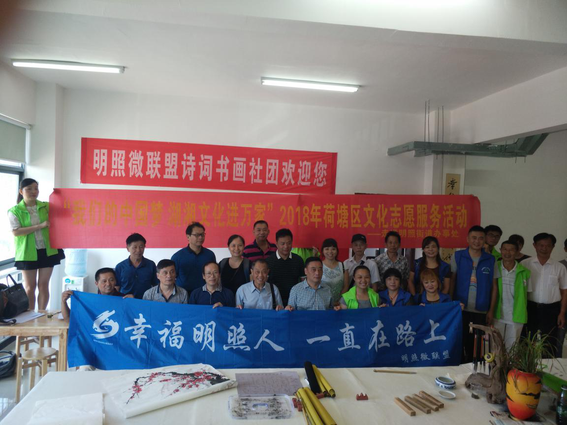 为迎接荷塘区“欢乐潇湘·欢乐株洲”群众美术、书法、摄影活动,7月13日上午九点,在明照街道金塘村村部二楼,“明照微联盟诗词书画社团”组织了一场书画笔会。参加本次活动的有明照街道办事处“诗词书画社团”团长贺金光及10多位成员、金塘村书法爱好者王新、吴文武等多名书画爱好者,同时还邀请到原株洲市二中副校长袁楚湘进行指导,明照街道微联盟全体盟主、荷塘区文化志愿者参与了此次活动。