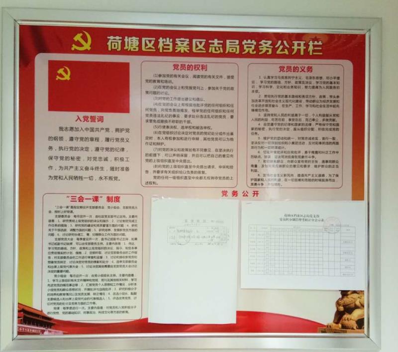 7月23日,区委第二巡察组进驻区档案区志局后,发现该局党建工作存在落实责任不细,未设置党务公开栏,未按照规定的内容、范围、程序等实施党务公开等问题,巡察组对此下达了立行立改通知书,提出相关建议,要求档案区志局予以整改落实,并将整改情况报巡察组销号。该局党支部虚心接受意见,当即指定专人负责完善党务公开栏,按要求及时公开党员群众关注的重大事项和热点问题,主动公开全局中心工作、思想建设、组织建设、作风建设、制度建设等重点内容,接受社会监督,立行立改。