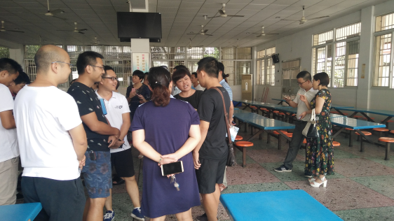 六〇一中英文小学校长易文胜和总务主任谭剑带领与会领导和老师到学校固定资产集中的学生餐厅、宿舍、教室及教师办公室参观固定资产清查成果。参观过程中,易文胜和谭剑耐心、详细地为大家介绍讲解,参观人员纷纷拍照,认真记录学习。