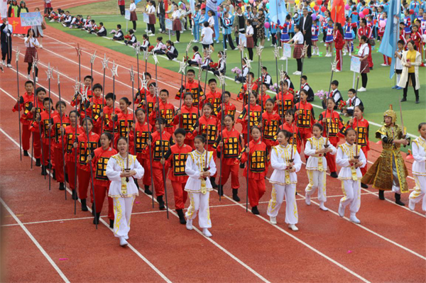 来自全区25所中小学校的运动员代表踏着阳光的步伐昂首阔步入场。嘹亮的口号与整齐的队列彰显着荷塘少年的青春与活力;刚劲有力的中国武术与活力四射的啦啦操碰撞出璀璨夺目的火花;悠悠葫芦丝邂逅创意杯子舞折射出七彩斑斓的阳光;优美潇洒的跆拳道与悠扬婉转的歌声散发着馥郁的气息;天真烂漫的舞蹈与自然洒脱的足球炫技闪烁着夺目的光彩。荷塘少年以舞为赞,以歌为咏,风华正茂地迈进运动场,开启他们的阳光运动之旅。