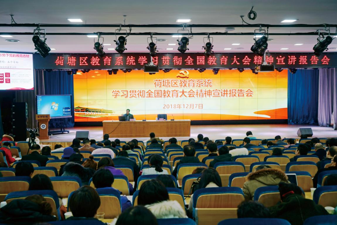 12月7日,荷塘区教育系统学习贯彻全国教育大会精神宣讲报告会在美的学校多功能厅举行。市教育局党委委员、副局长李建国作了题为《学习贯彻全国教育大会精神,全面提高教育质量》的专题宣讲,报告会由区教育局党委书记、局长韩永斌主持。