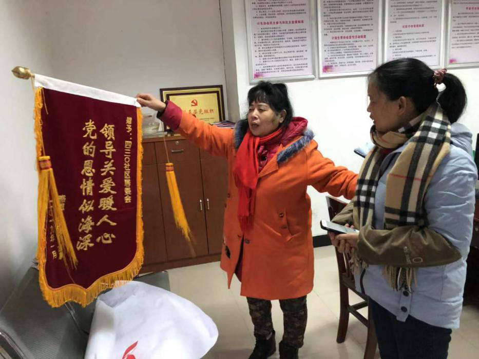 四三〇社区计生特困户刘俊英,系宋家桥街道四三〇社区社区计生特扶家庭,早年丧偶,儿子患有三级精神残疾,家里只靠她一个人的工资维持生活,四三〇社区的工作人员时常会去看望她,给她力所能及的帮助。锦旗上写着的“领导关爱温暖人心,党的恩情似海深”这十五个字道出了刘俊英的心声。