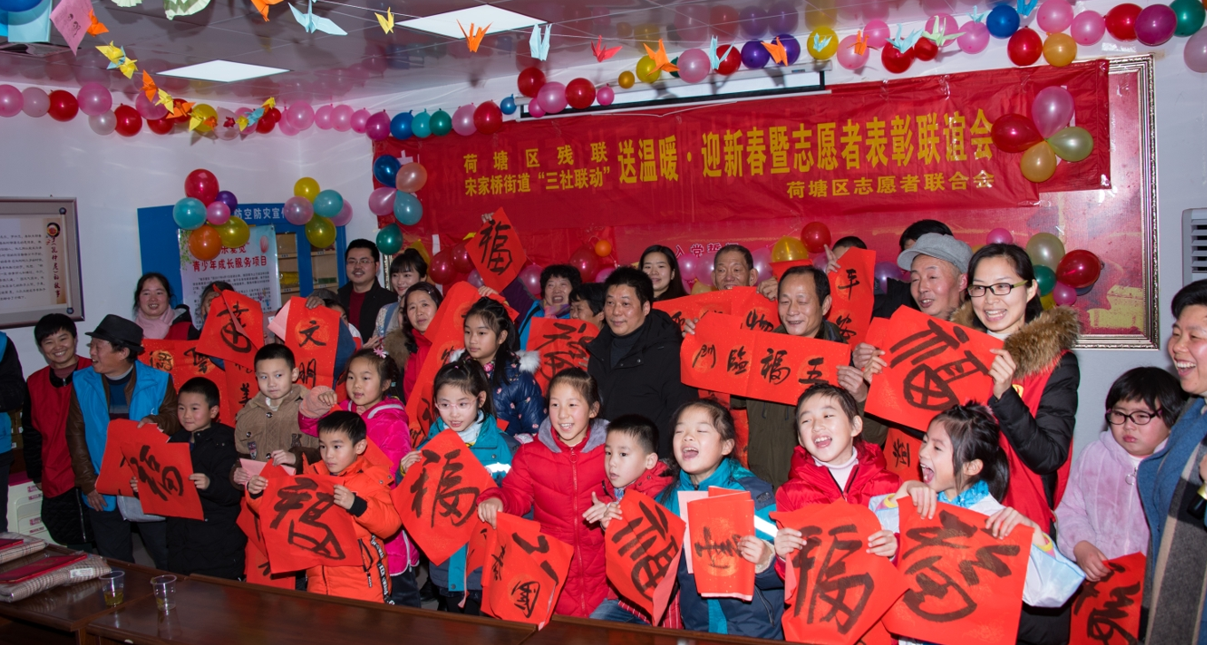 在活动现场,“美乐爱觉”小志愿者和“折翼天使”残疾朋友开展了精彩纷呈的节目表演,街道对优秀志愿者进行了表彰奖励,本土残疾书法家吴月鸿现场进行“秀书法,送春联”活动。活动结束后,荷塘区志愿者联合会、宋家桥街道“微义工”志愿者服务中心组织社工和志愿者上门走访慰问辖区贫困残疾朋友,并为他们送上了可口的“年夜”菜肴、贴身保暖衣物等,提前为他们送去了节日的慰问。