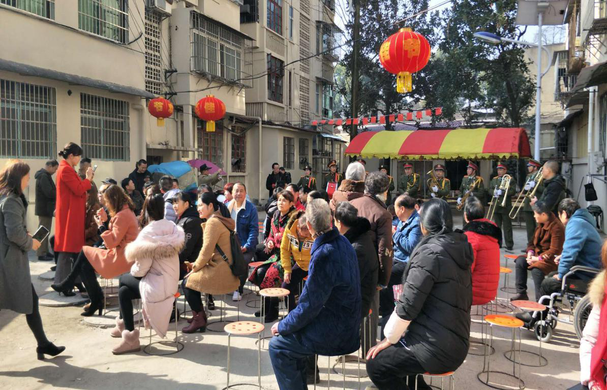 走进现场乐队演奏,舞龙狮非常的热闹,由桌子临时拼凑成的操作台上,变成了大厨房,辖区居民和街道工作人员人员共同揉面、擀皮、剁馅、包饺子,一片热闹的景象。大家揉出了对邻居的那份情,包出了对居民的那份爱。