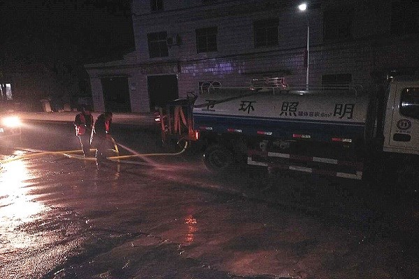 环卫工人深夜清洗道路