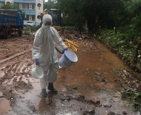 在潮湿闷热的高温天气中,防疫人员身着全封闭防护服,对全校所有存在感染可能的地方,如学校操场、篮球场、渠沟、房屋墙面、塌墙附近以及车棚等地进行全覆盖环境消毒。为确保全校师生的身体健康和生命安全,我中心在消杀防疫的同时也开展了汛情过后对于饮水、饮食、肠道传染病以及环境卫生安全等卫生防病知识的宣传教育工作,期间共发放灾后防疫指南宣传折页数百份,指导学校正确防疫救灾。
