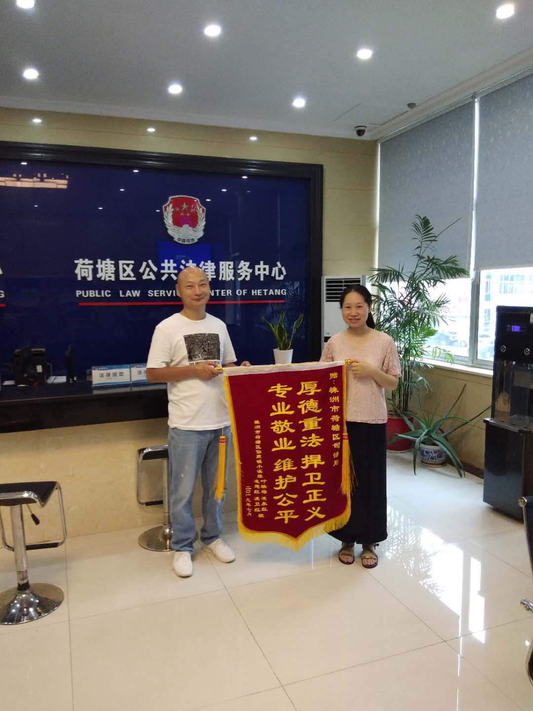 7月5日上午,在荷塘区司法局公共法律服务中心的大厅,受援人代表凌某将一面锦旗送到了承办律师手中,真诚表达对政府法律援助制度以及荷塘区司法局法律援助中心工作人员及承办律师的感激之情。