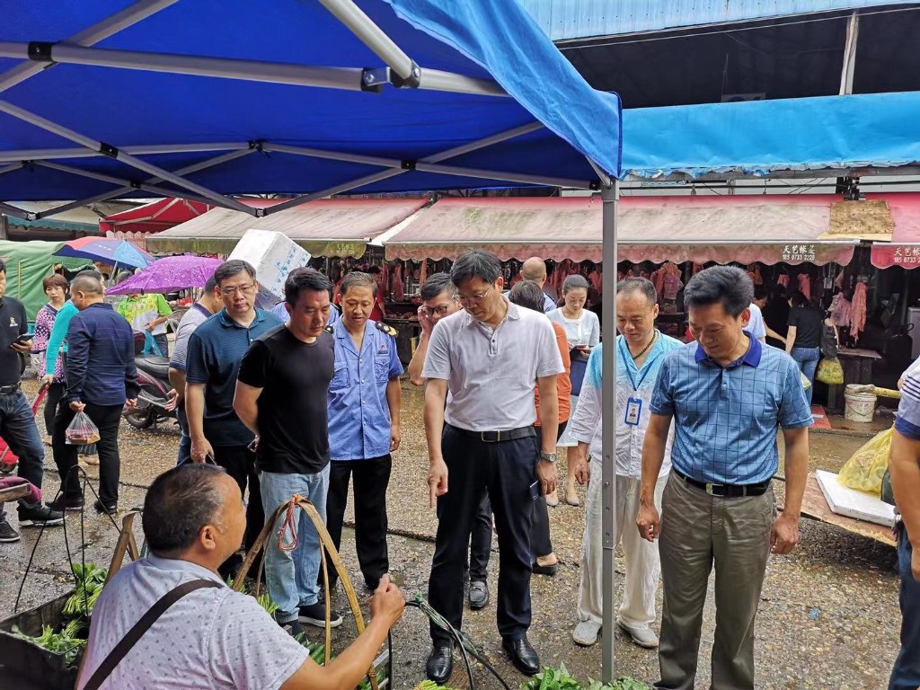 为确保汛期食品药品市场秩序和质量安全,7月13日上午,市市场监督管理局局长李余粮一行来到荷塘区步步高超市和中南蔬菜批发市场检查汛期食品药品安全监管工作,副区长陈柏文、区市场监督管理局负责人罗炽威和郭维陪同。