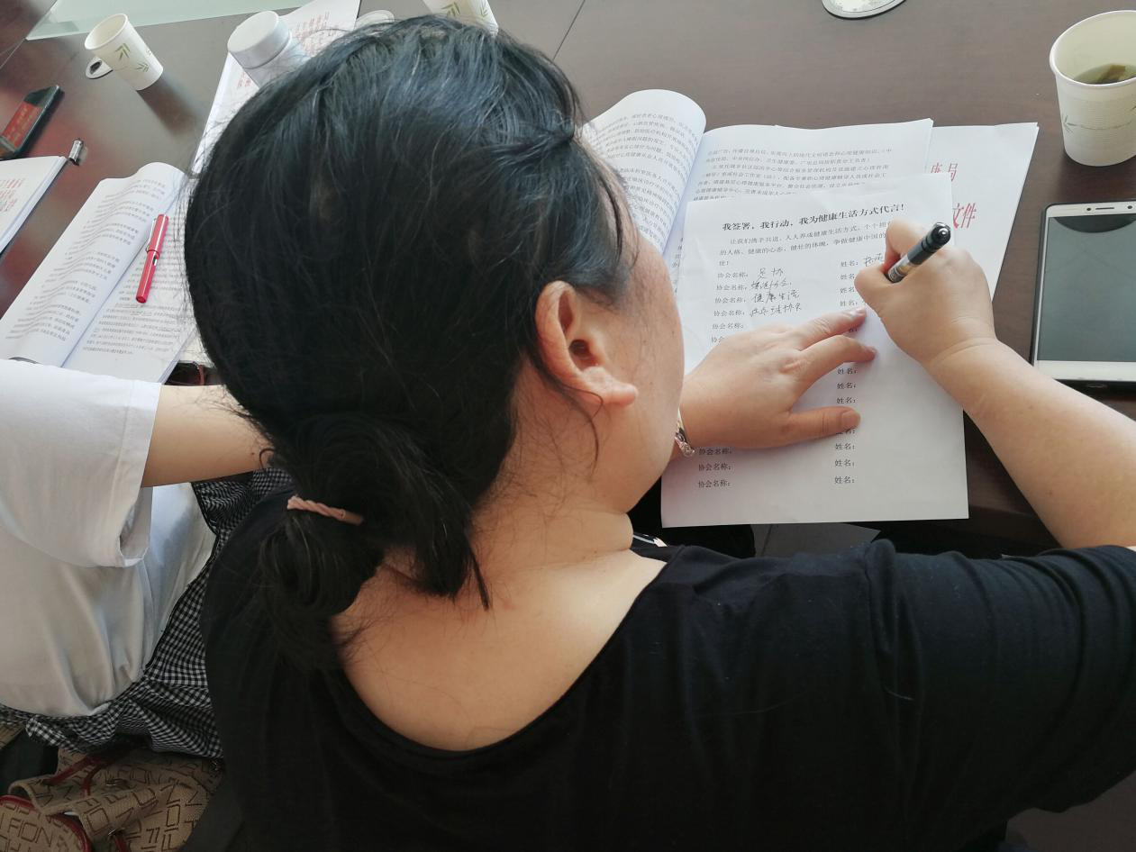 会议中,荷塘区全民健康生活方式行动协调小组办公室主任胡晓玲将《健康中国行动》以及《荷塘区健康生活方式行动方案》进行了详细讲解,并就文体系统以及各文体协会在行动中所要承担的职责和任务、指标进行了一一阐述和工作建议。她在会上发起“带头践行健康生活方式,积极开展面向家庭、单位、社区的健康教育和健康生活方式促进活动,让人人成为健康生活方式的实践着和传播者。健康与生命相连,生命靠健康促进。让我们行动起来,全民发力,共同为推进健康中国而奋斗!”的倡议书,与会者全部签署代言书。区文体旅局贺春庆在会上作了强调,要求各个街道办事处、各个协会全力以赴参与、支持、配合此次行动。