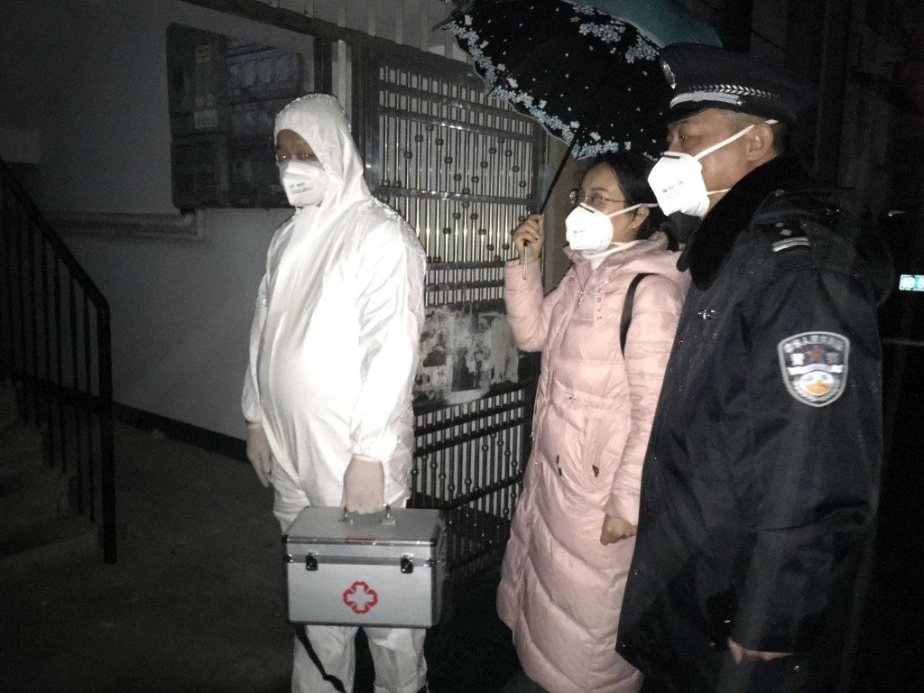 街道工作人员、社区及派出所工作人员一同上户为武汉回湘人员测量体温