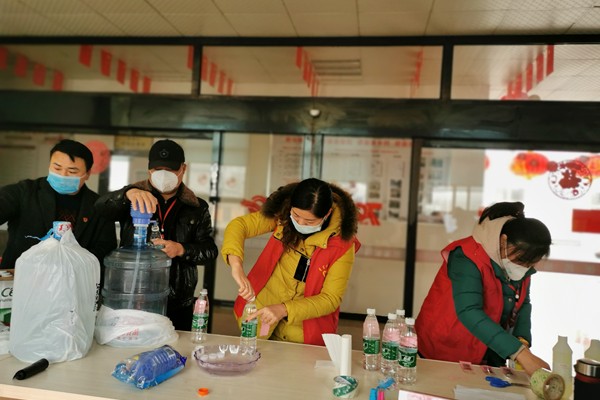 明照街道各村纷纷协调社会资源,由村委员会进行统一采购后,对村民进行发放,现共向群众派发1.3万余个口罩,900余瓶消毒液和酒精。星星村2月1日上午将采购来的散装医用酒精用矿泉水瓶灌装后,当天下午分发到了全村700余户村民家中,用于村民家中日常消毒,同时向村民宣传了酒精的使用方法以及生活中的注意事项。