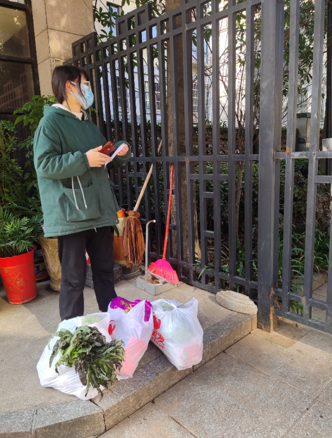 为了保障隔离居民的生活物资补给,降低其外出造成交叉感染的风险。凌凤求积极利用微信收集每户居民生鲜蔬菜和生活用品的数量需求,并徒步前往超市集中帮居民采购。为了保证交易,她尽量一户一付,保存交易凭证,便于居民清点物品。为了保证安全,她每到一户门前,都会敲敲门说:“xxx,你们家的东西都买齐了,放在你家门口,我先走啦。”采购、搬运、送货上门……经常一天下来,作为一个年轻人都腰酸背痛。有社区居民在窗户里对她喊:“好姑娘,你辛苦了,休息一下吧!”凌凤求都笑着摇摇头说:“一线医护人员和公安干警冒着生命危险,保我们平安,我只是跑一下腿,没什么的。”