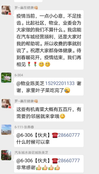 罗姐的举动让业主们非常感动,大家纷纷提出要有偿购买,但都被罗姐婉言拒绝了。她朴素的说:“伙夫餐饮店能够在汽车城社区经营得下去,都亏了平日业主们的信任和捧场。抗击疫情的特殊时期,我也想做一点小贡献。一点蔬菜,不足挂齿,都是新鲜采摘,大家安心吃就是对我的鼓励。”