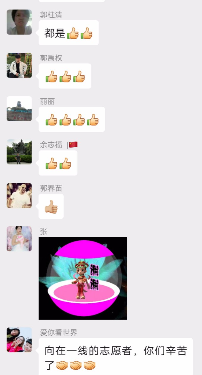 “天寒地冻的,你们千万别感冒了”“为太阳村最美战士点赞”“你们时刻守护着我们的健康,我们也只能尽微薄之力,用这些小小心意,略表我们的感谢”……这些暖心话语在太阳村各个微信群“爆”出,给一线值守人员莫大支持。太阳村村书记郭争说,有了群众的支持和理解,相信这场战“疫”一定能够打赢。