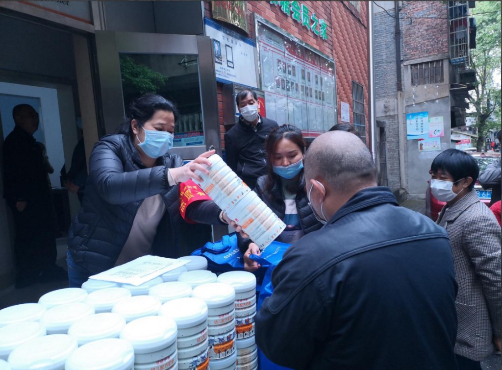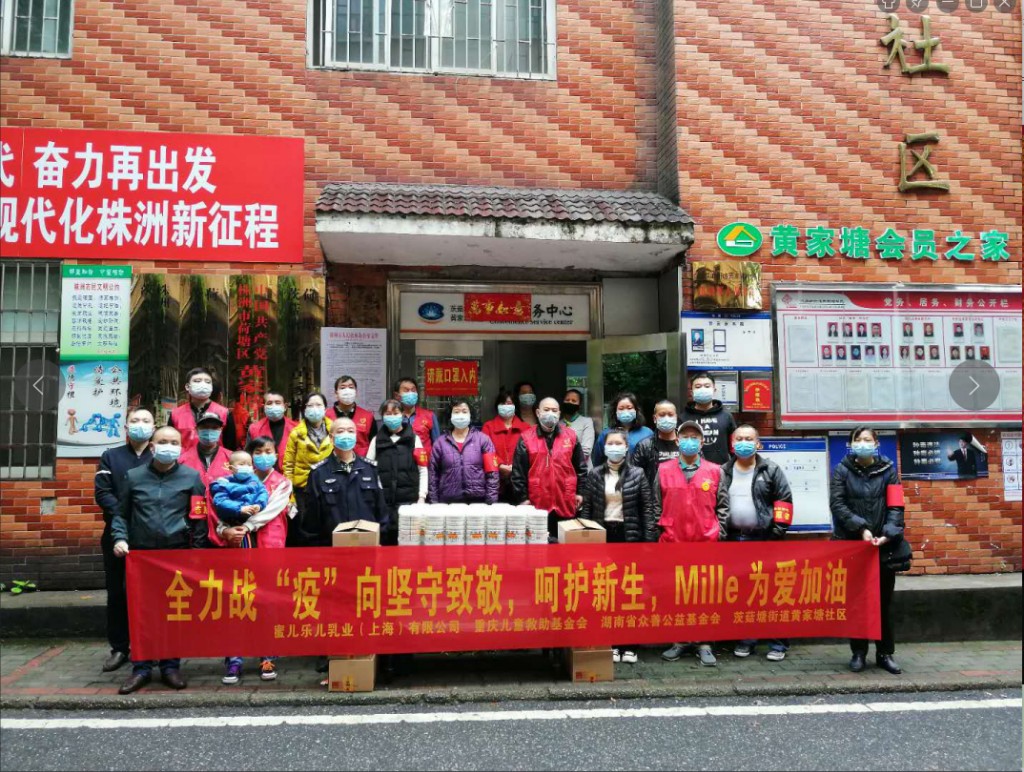 为致敬基层工作人员与志愿者为疫情防控工作做出的无私奉献,4月23日,由蜜儿乐儿乳业(上海)有限公司、湖南省众善公益基金会、重庆儿童救助基金会联合荷塘区茨菇塘街道,在黄家塘社区开展“全力战疫,向坚守致敬,呵护新生、MILLE为爱加油”奶粉捐赠公益活动。