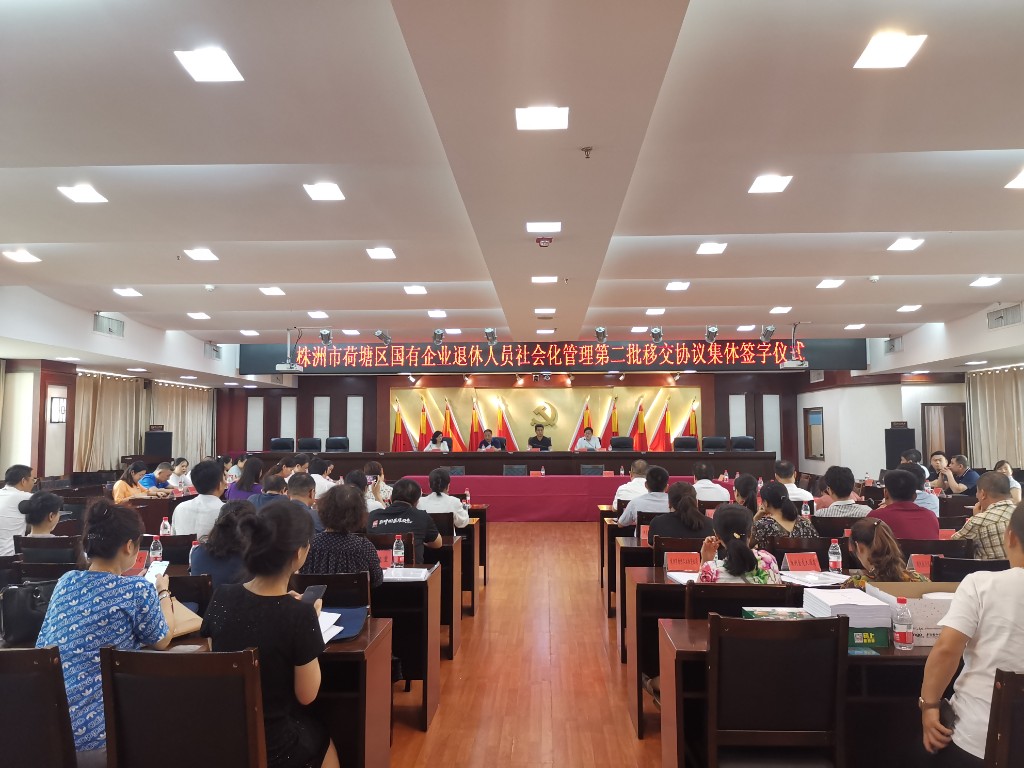 6月24日下午,荷塘区召开国有企业退休人社会化管理第二批移交协议集体签字仪式。株洲市国资委副主任刘建荣、荷塘区人民政府副区长刘必林出席并作重要讲话,仪式由荷塘区人力资源和社会保障局局长周湘雄主持,区直相关部门及相关企业等49家单位参加会议。