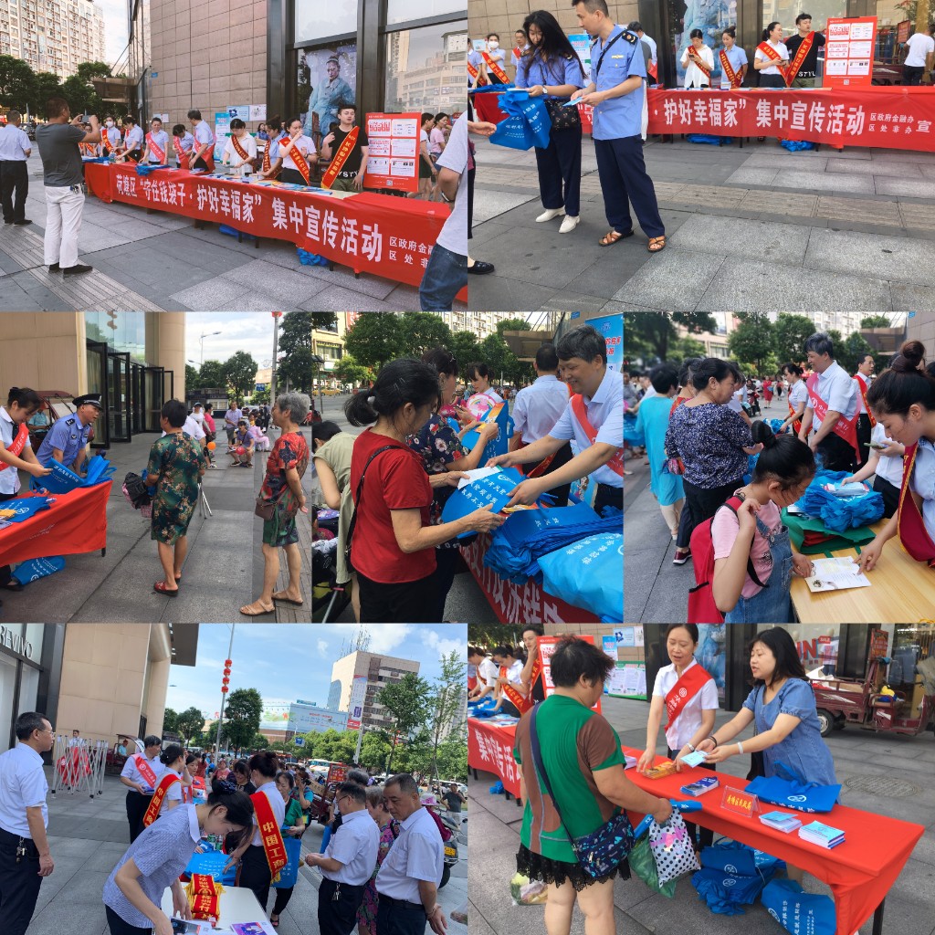 7月7日上午,区政府金融办(区处非办)组织区民政局、区市场监督管理局、区公安分局、金山街道办事处等单位,株洲农商行、邮储银行、华融湘江银行、长沙银行、农行和工行6家金融机构,在红旗广场银泰财富前坪举行了“守住钱袋子,护好辛福家”为主题的防范非法集资宣传教育活动。