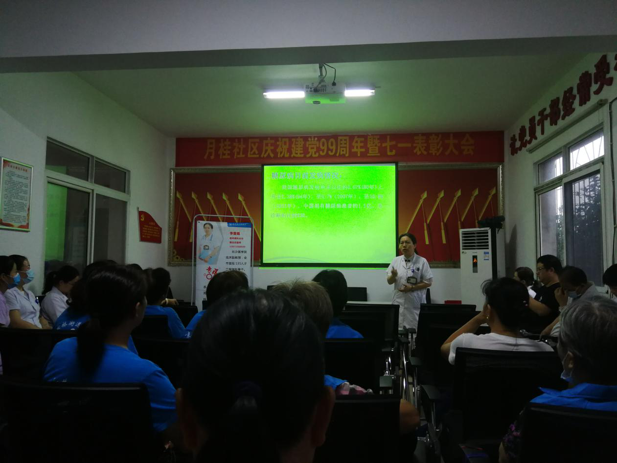 活动现场,株洲市人民医院老年病科主任、副主任医师李雯霞通过多媒体为居民们深入浅出的讲解了糖尿病的病因、症状、并发症、治疗和预防方法,指出了居民们对糖尿病治疗方面存在的一些误区,提出了合理营养饮食指导及运动方式,倡导大家要保持良好的生活习惯和作息规律,并现场解答居民提出的疑问。同时,随行医护人员为前来听讲座的居民进行了免费测量血压、血糖等体检活动。讲座结束之后,医护人员在社区工作人员、志愿者的陪同下对辖区居民进行上门义诊,免费开展身体检测、用药指导等服务。