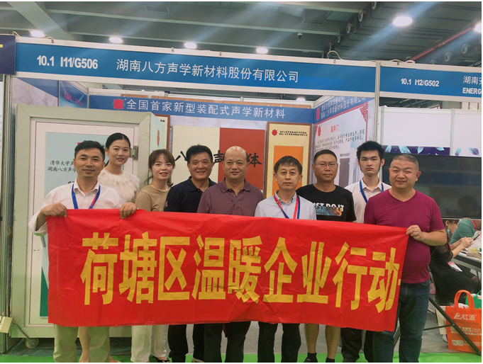 荷塘区企业集工程设计、施工、咨询及噪声治理一体化解决方案亮相展会,吸引了国内外百余家客户的关注,达成合作意向30余个。其中,湖南八方声学新材料股份有限公司展示的声学新材料硅晶砂吸声体、隔声门、隔声窗和隔声房产品,展现了企业先进、安全、绿色低碳的技术优势,获得了超高的人气。