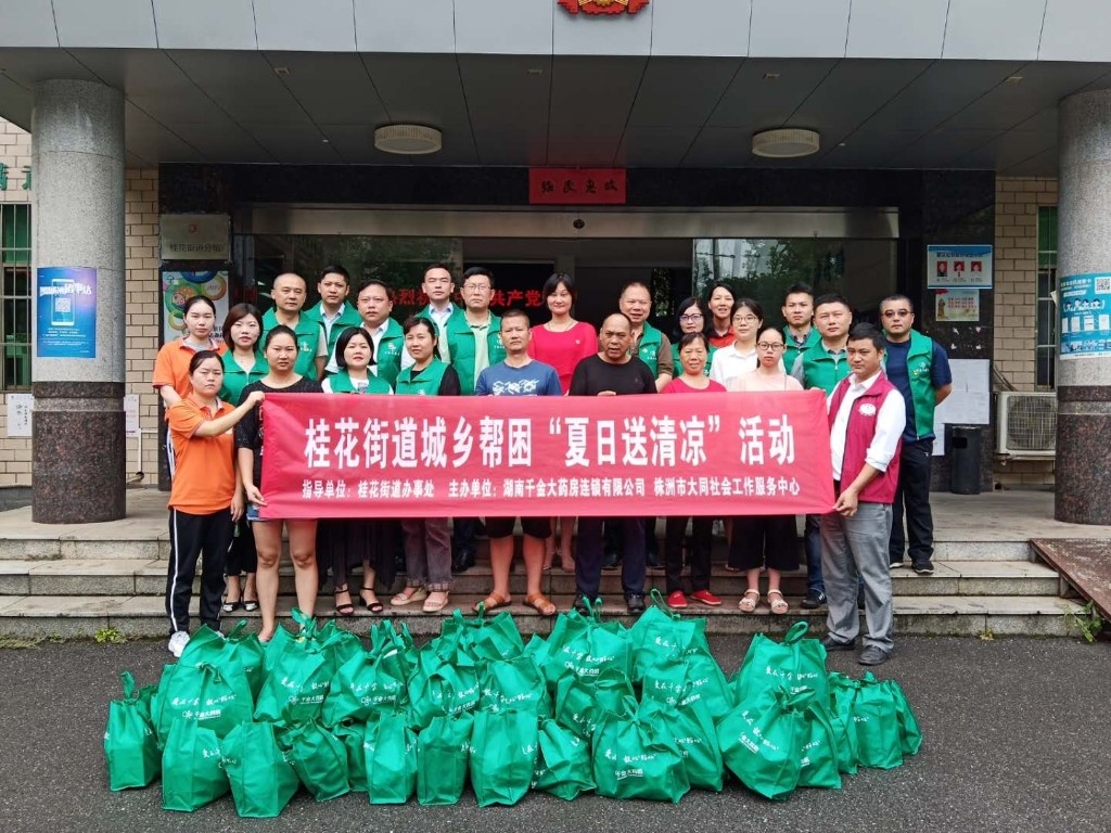 8月11日上午,为了让服务对象在夏天的余温中感受到一份清凉,桂花街道办事处党工委书记邓思思、办事处副主任陈静携手湖南千金大药房副总经理朱大明、千金大药房党员、入党积极分子以及大同社工和志愿者,将60份降暑物资送至部分服务对象家中。