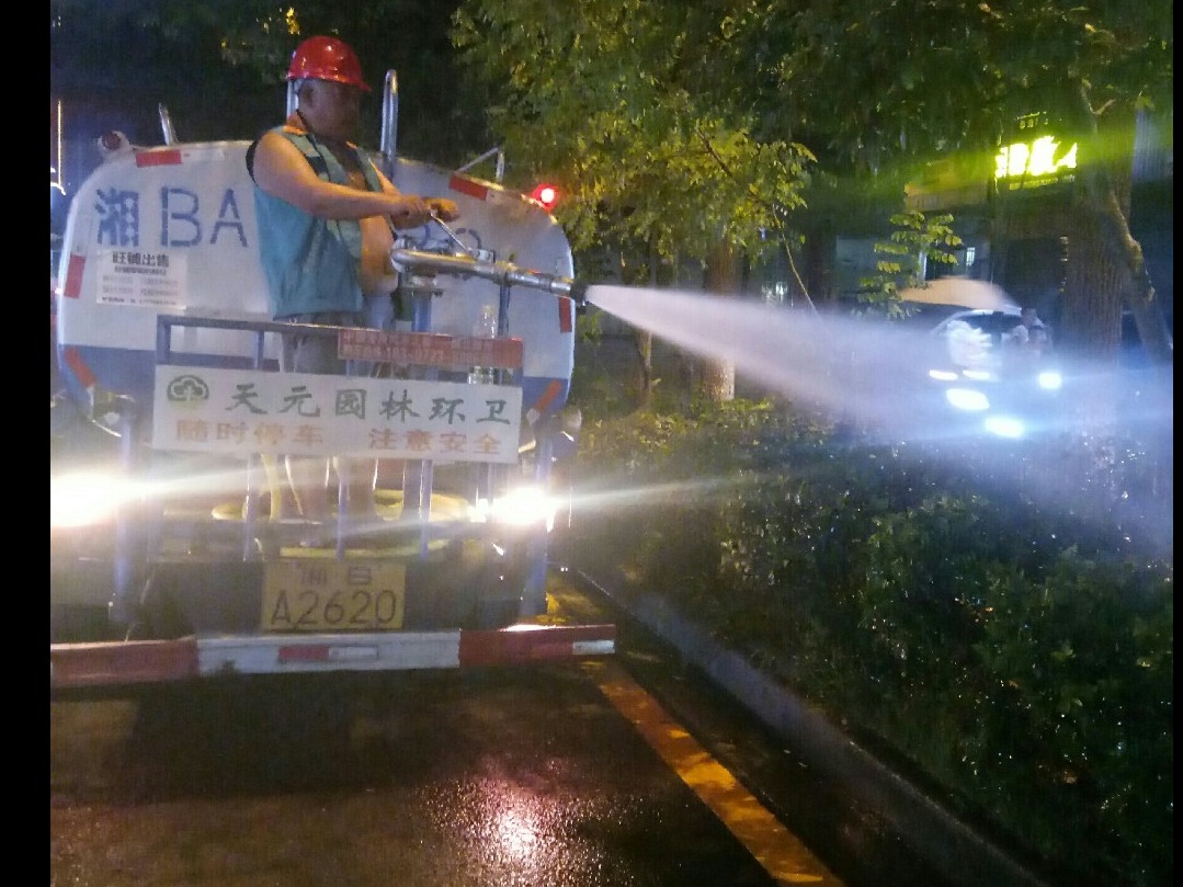 晚上10点左右,一辆装满水的绿化洒水车在绿化带旁的道路上来回穿梭,时而低速运行,时而在绿化带旁停下,工作人员拿起洒水管,打开阀门,开始对绿化苗木浇水。工作人员吴卫星说“我们每晚从7:00持续到近24:00才能把辖区内绿化带的苗木全部浇一遍,确保不漏掉任何死角”。