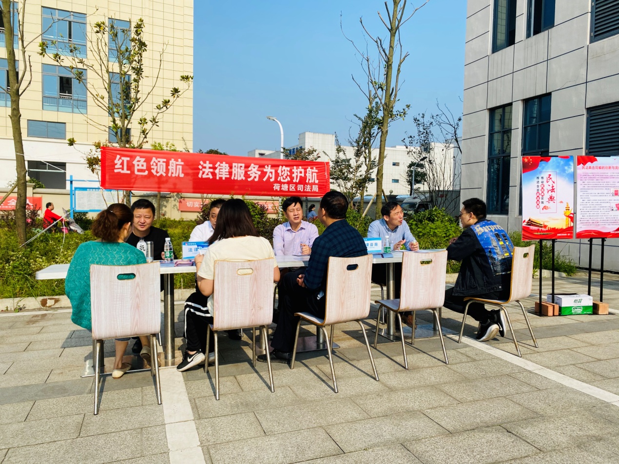 为进一步加快园区公共法律服务体系建设,深入贯彻落实习近平总书记在民营企业座谈会上的重要讲话精神和"要广泛开展民法典普法工作"的重要指示精神,充分发挥《民法典》的引领作用,优化园区企业营商环境、增强企业员工的法治观念和法律素养,10月13日,荷塘区司法局组织法律服务团队深入荷塘区金山工业园,开展以"法律服务为您护航"为主题的民法典专题宣传活动。