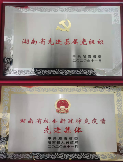 "湖南省先进基层党组织""湖南省抗击新冠肺炎疫情先进集体"双料荣誉奖牌