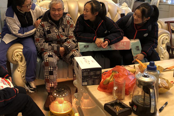 上午九点半,同学们按时到社区集合。社区工作人员将同学们分成二大组,分别慰问逸都花园和明照安置房的老人。在社区工作人员的带领下,第一小组的孩子先来到了逸都花园的退休老教师黄老师家中。黄老师原是某学校校长,政教处主任,黄老师看到孩子们的到来十分高兴,仿佛又回到了自己年轻的时候。虽然他由于身体方面的原因,说话不利索。为了让他开心,孩子们都十分活跃,争相挽着老人的手和他说话,在老人的言语中逐渐了解着他年轻时候为工作付出,为学生付出的那段难忘岁月。另外的一组孩子则来到姜师傅家中。姜师傅丧偶多年,女儿在深圳,一年难回一次,平日里只有他一人在家。孩子们一进去就“姜爷爷,姜爷爷”地叫。姜师傅看到这么多青春可爱的面孔,一下就逗乐了,欢迎着孩子们的到来。