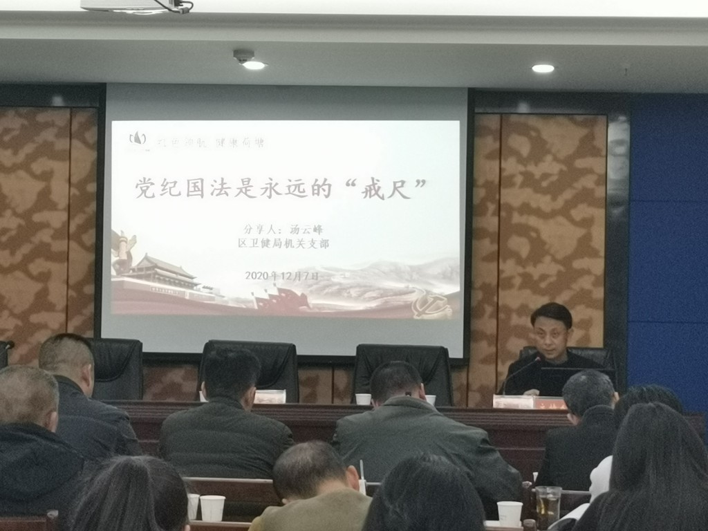 会上,区卫健局党委委员、派驻区卫健局纪检监察组组长汤云峰为全体党员上党课,党课主题为“党纪国法是永远的‘戒尺’”,号召广大党员和领导干部自觉增强纪律意识,自觉接受纪律的约束,真正把纪律挺在前面。随后,区妇幼中心主任田映平带领党员进一步学习党的十九届五中全会精神。同时,由区疾控中心支部书记谢爱萍带头学习习近平在中央全面依法治国工作会议上的重要讲话精神,党员们纷纷表示要认真学习领会习近平法治思想,切实把习近平法治思想贯彻落实到工作全过程。