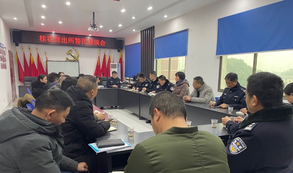 为进一步做好辖区安全防范工作,提升群众安全感满意度,全面打造平安和谐幸福家园,1月7日下午,桂花派出所组织开展警民恳谈会,桂花街道党工委书记邓思思,街道党工委委员、人大工委主任黎伟,桂花派出所民警,各村(社区)书记、综治专干参加了此次恳谈会。