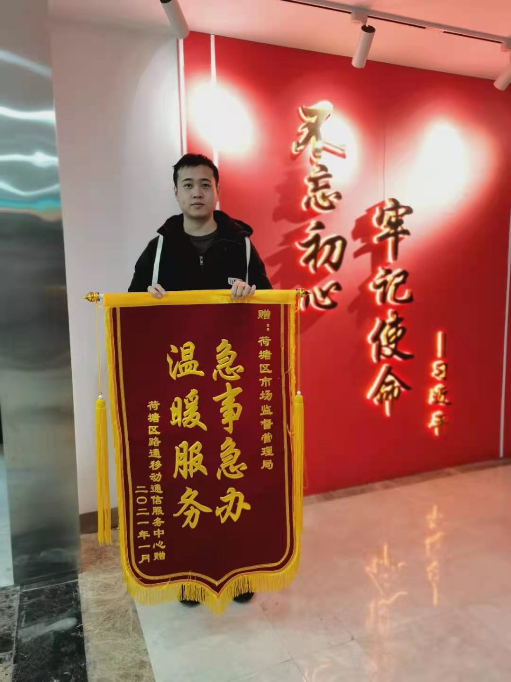 2021年1月5日下午,荷塘区路通移动通信服务中心负责人胡女士来到株洲市荷塘区市场监督管理局行政审批股办公室,把一面绣有“急事急办、温暖服务”的锦旗送到工作人员手中,对荷塘区市场监管局的行政审批优质高效服务表示感谢并点赞。