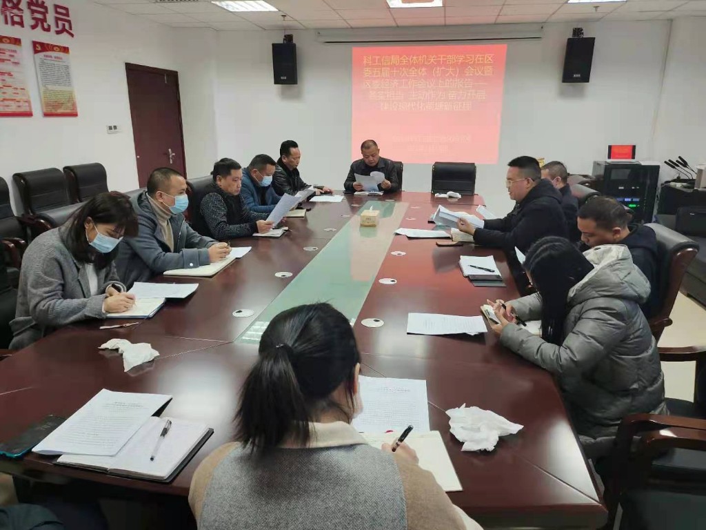 1月18日下午,区科工信局召开全体机关干部会议,专题传达学习区委五届十次全体(扩大)会议暨区委经济工作会议精神,会议由局党委书记、局长曾健主持。