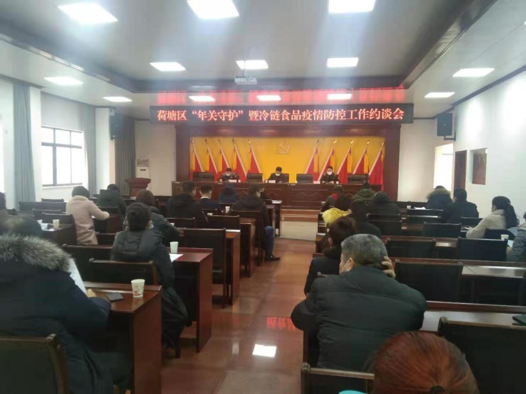 为贯彻落实疫情防控工作要求,1月26日下午,荷塘区市场监管局组织辖区内大型商超、餐饮、农贸市场及食品生产企业召开集体工作约谈会议。会议对前一阶段冷链食品核酸检测等疫情防控工作进行总结,对春节期间疫情防控相关工作进行再动员再部署。此次会议共有31户冷链食品经营单位参加。