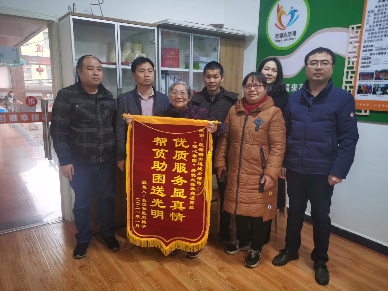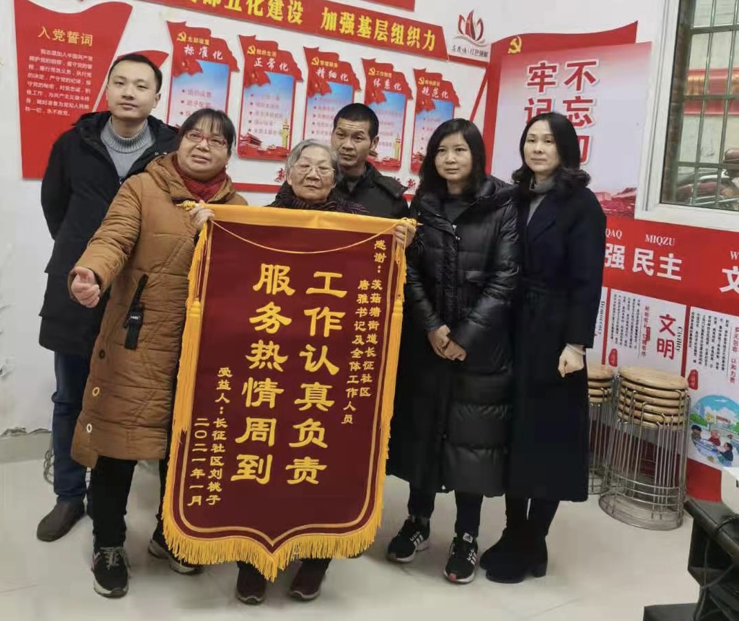 2月1日一大早,茨菇塘街道长征社区居民刘桃子向街道和社区送来印有"优质服务显真情,帮贫准困送光明"和"工作认真负责,服务热心周到"字样的锦旗,借以表达街道和社区对她的关心和帮助。