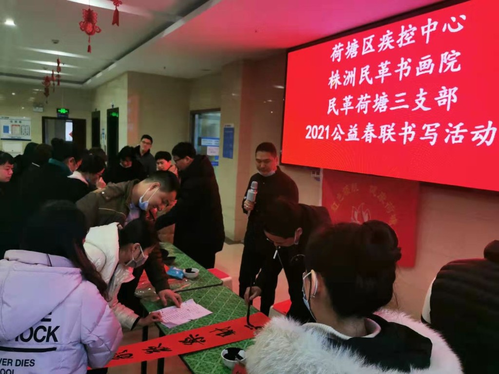 “无联不成春,有联春更浓”。为迎接农历新年的到来,传承中华民族传统文化,2月8日下午,荷塘区疾控中心联合民革荷塘三支部开展2021年公益春联书写活动,钟正午、钟建文、邓珊妮、梁卫伦等数位资深书法家来中心为群众写春联、送“福”字。