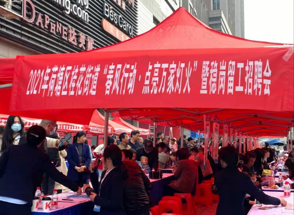 3月14日上午,荷塘区桂花街道办事处在华晨白云广场大润发前坪,举办了2021年“春风行动·点亮万家灯火”暨稳岗留工线下第二场招聘会。
