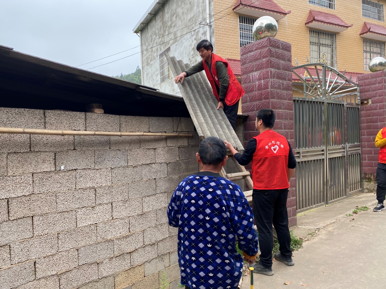 在太阳村,一六十多岁的独居老人,其居住的房屋因为瓦片年久失修,每当下雨时,房间里总是漏雨不断,给老人的生活造成了诸多不便。太阳村支村两委工作人员知道后,便向街道和驻村队员说明了情况,借助主题活动的机会,机关支部党员、太阳村支村两委工作人员、驻村工作队队员及群众志愿者将近二十人一起为村中独居老人修补漏雨房顶。一行人买好树脂瓦,带着工具,清杂、捡漏、换瓦,帮村民楼上的屋顶瓦片进行更换。老人坐在一旁看着这么多人帮忙,感激地话说了一遍又一遍。"之前房子一到下雨就漏水,根本没法居住,现在房子帮忙修好了,住起来也安心了,非常感谢各位党员同志的帮忙,也感受到了党和政府的温暖。"老人说道。