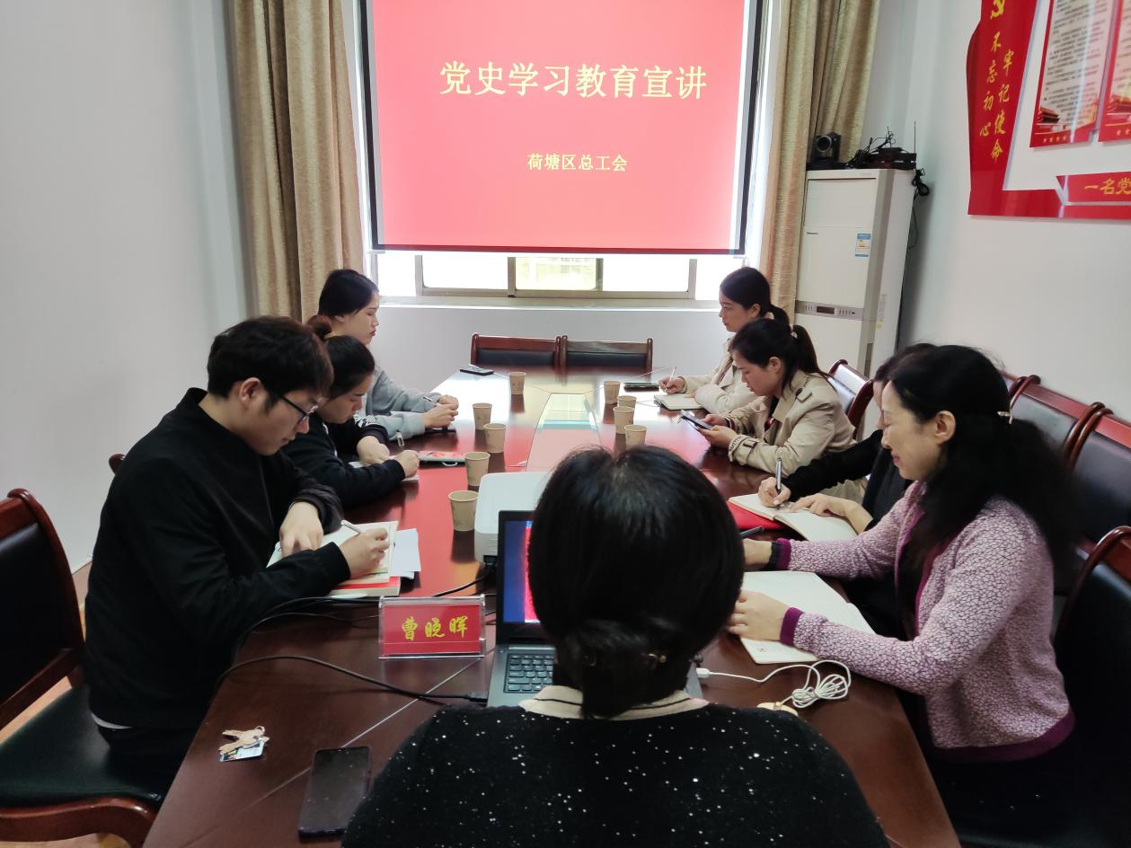 为深入贯彻习近平总书记在党史学习教育动员大会上的重要讲话精神和湖南省党史学习教育动员会议精神,4月22日上午,荷塘区总工会组织开展党史学习教育宣讲活动,按照区委的工作要求,引导党员干部做到学史明理、学史增信、学史崇德、学史力行,学党史、悟思想、办实事、开新局。区总工会党员干部、社会化工会工作者参加学习。