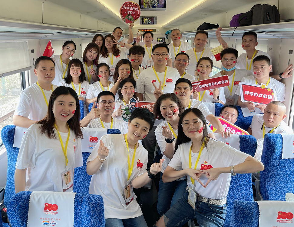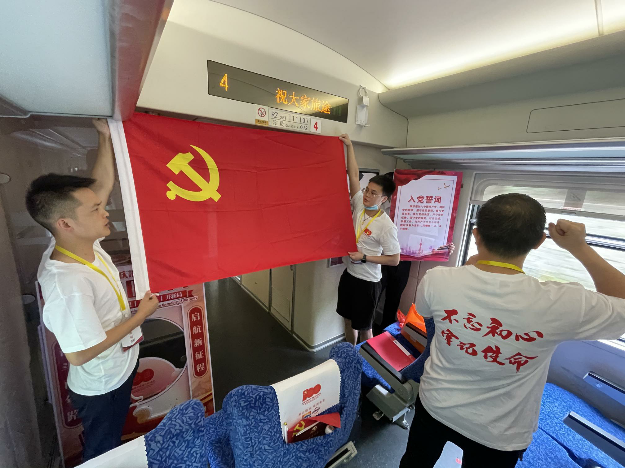 在红色专列上,全体党员面对党旗庄严宣誓:“我志愿加入中国共产党……”在铮铮誓言中回溯初心根脉。随后,党员们聚精会神地观看了精品党课、感受革命先烈的英雄事迹,在主持人的带领下我们集体高唱红歌、开展红色知识趣味问答等系列活动,欢声笑语响彻车厢,到了午饭时间,党员们津津有味的吃起了红军餐,在餐食中忆苦思甜,感受革命先烈伟大的家国情怀。