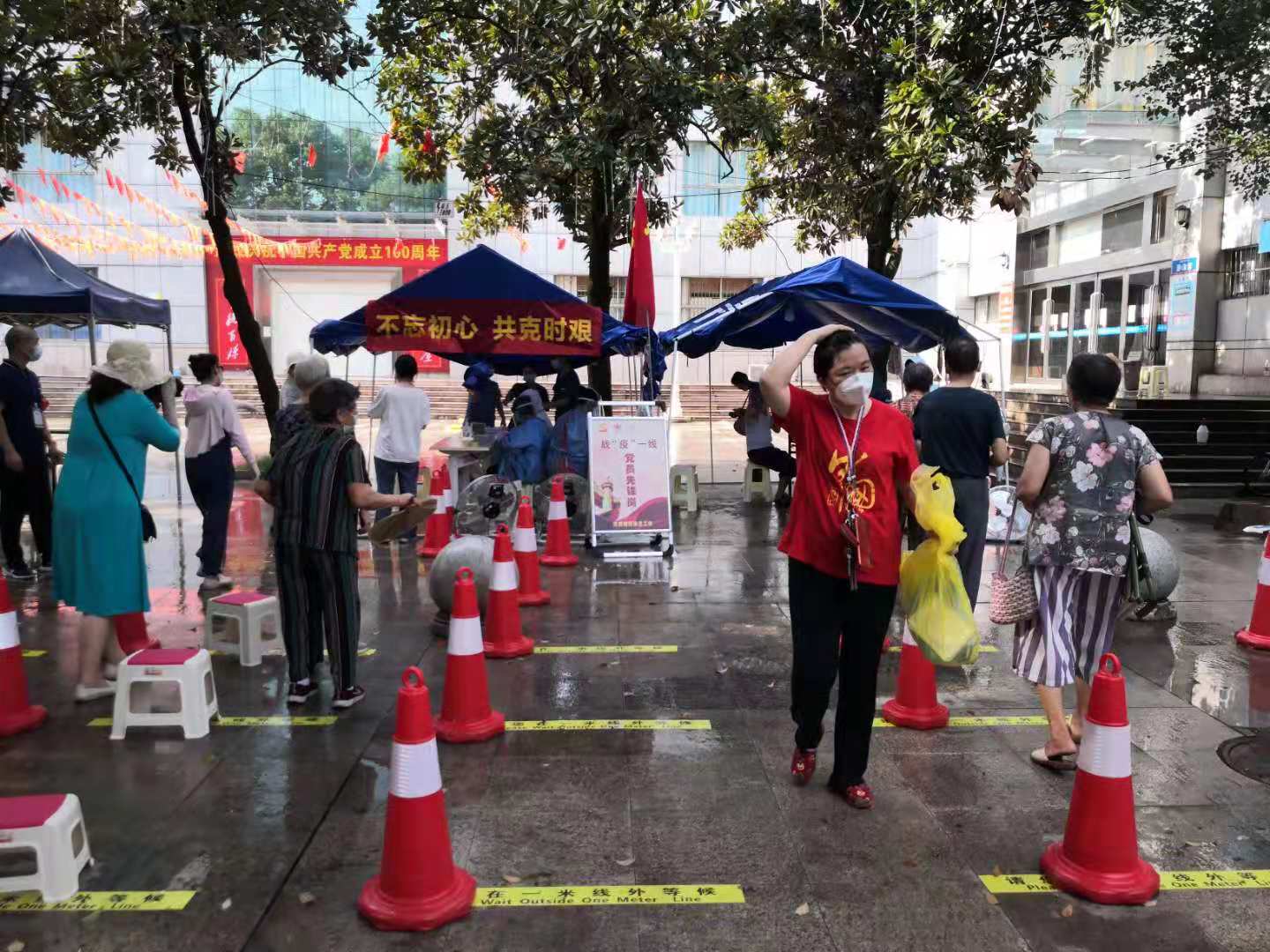 根据第一轮全员核酸检测经验,街道在场地布置、人员配备、群众组织发动、防暑降温等方面作出统筹安排,对流程和人员配置进行了再优化、再完善。在每个核酸检测点都有街道机关干部、区直单位支援干部、社区工作人员、志愿者等组成的"党员先锋岗",引导群众有序排队、分批进场采样,紧密配合医护人员做好检测信息登记工作。充分考虑天气炎热等因素,各检测点均准备充足防暑降温物资,为医护人员和工作人员送来清凉和关怀。
